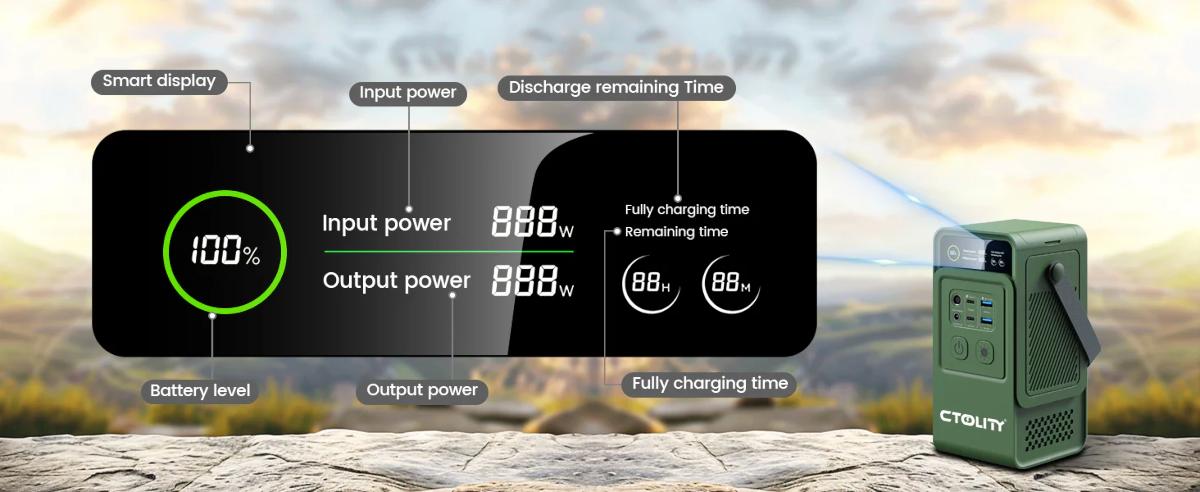 Пристрій обладнаний інформативним дисплеєм, який у реальному часі відображає потужність заряджання та розряджання, поточний рівень заряду, а також орієнтовний час до повного заряджання або розряджання. Це дозволяє точно контролювати енергоспоживання та ефективно планувати використання станції в будь-яких умовах.