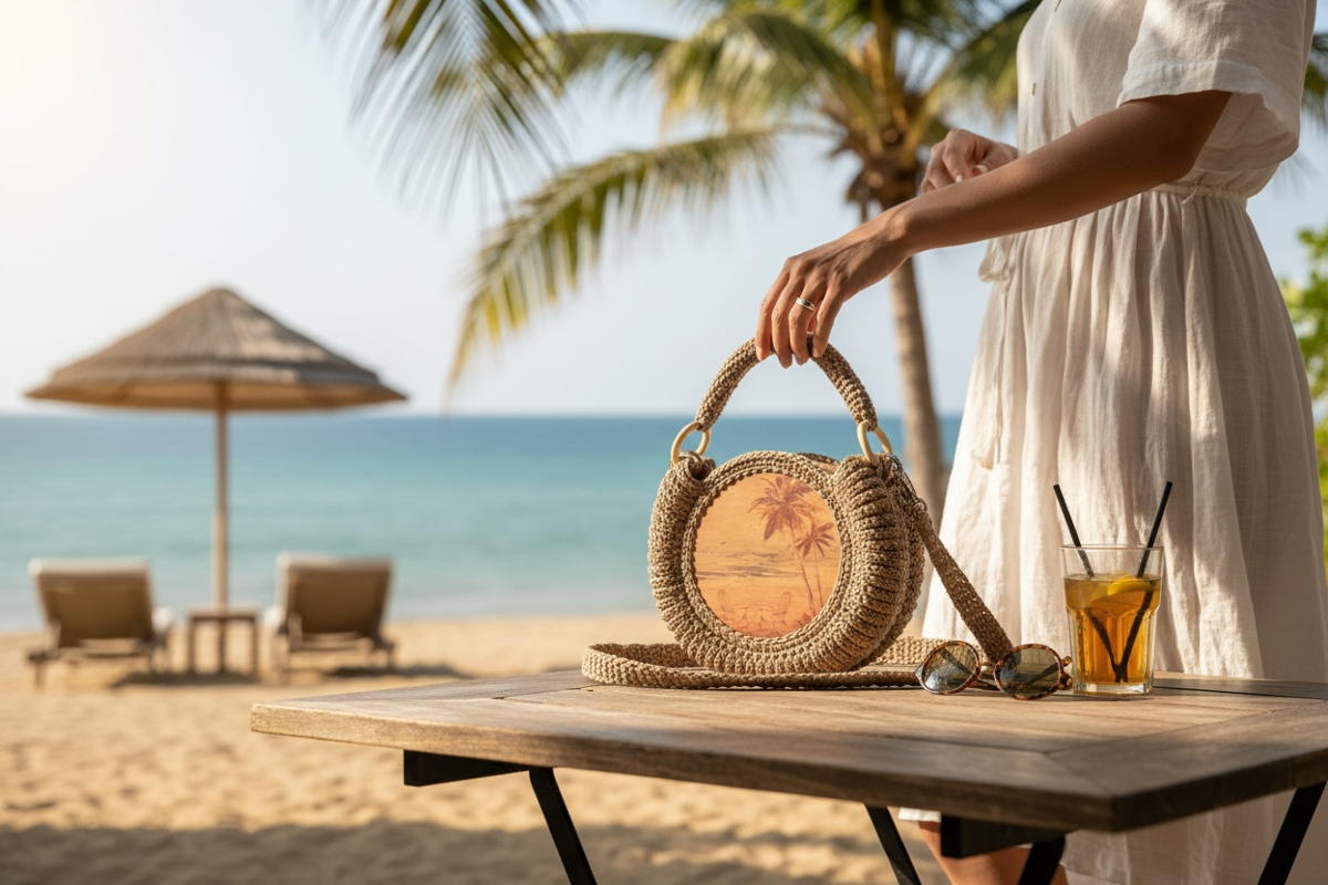 Фурнiтура сумочки – металева і деревʼяна.